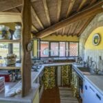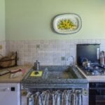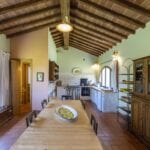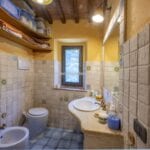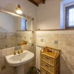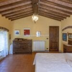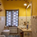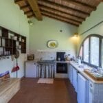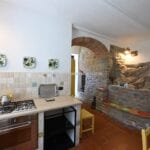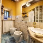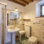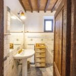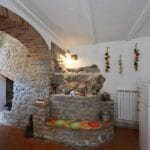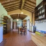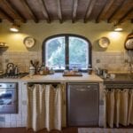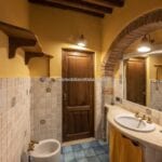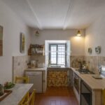 Renovations have retained the historic integrity using typical Tuscan materials. Bathrooms and kitchens feature rough travertine tiles, smooth travertine countertops, terracotta floors, handcrafted ceramic decorations, and untreated brass faucets, enhancing the authentic rustic Tuscan style.