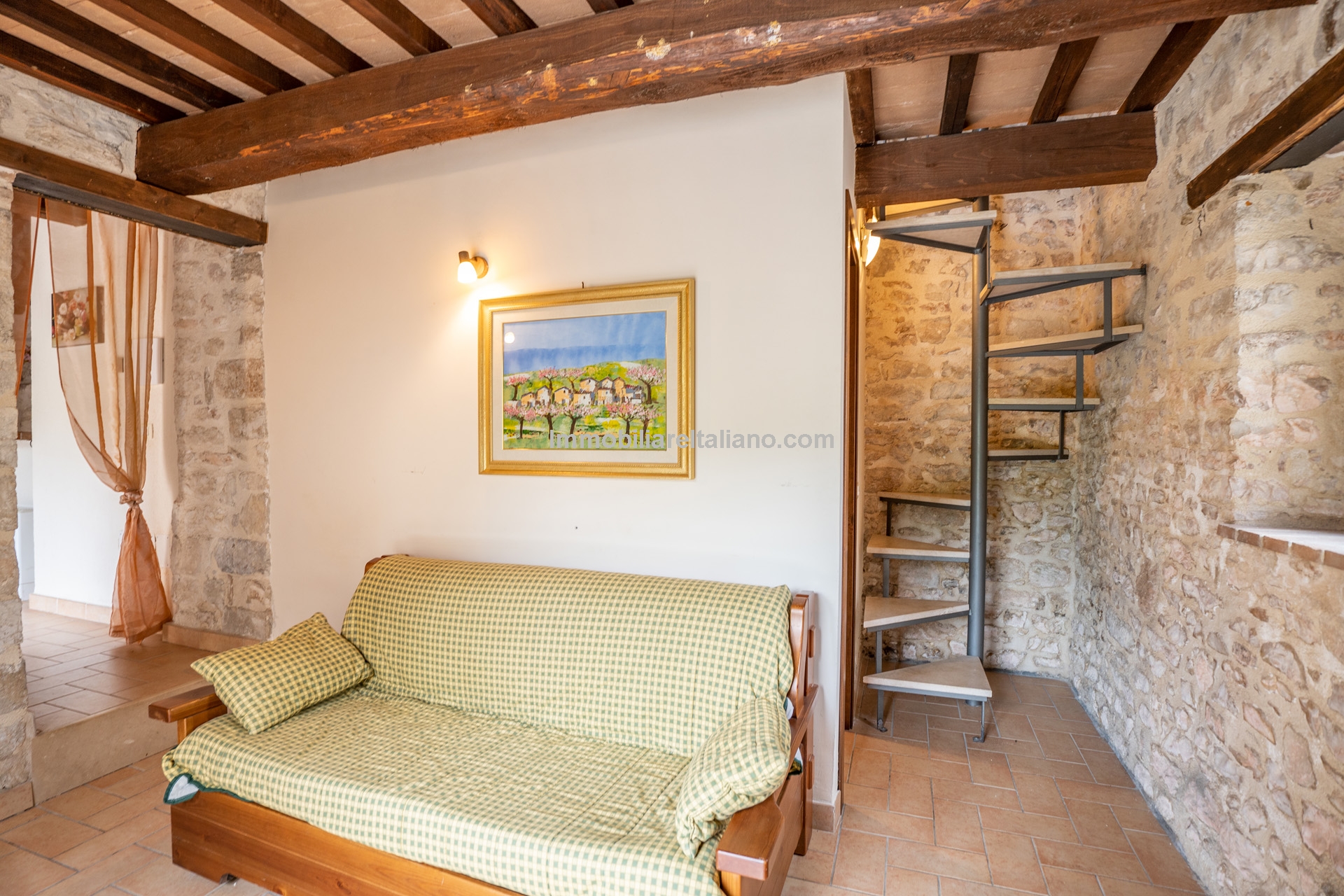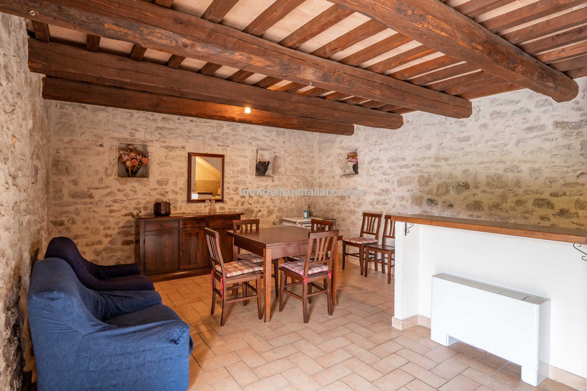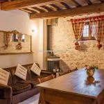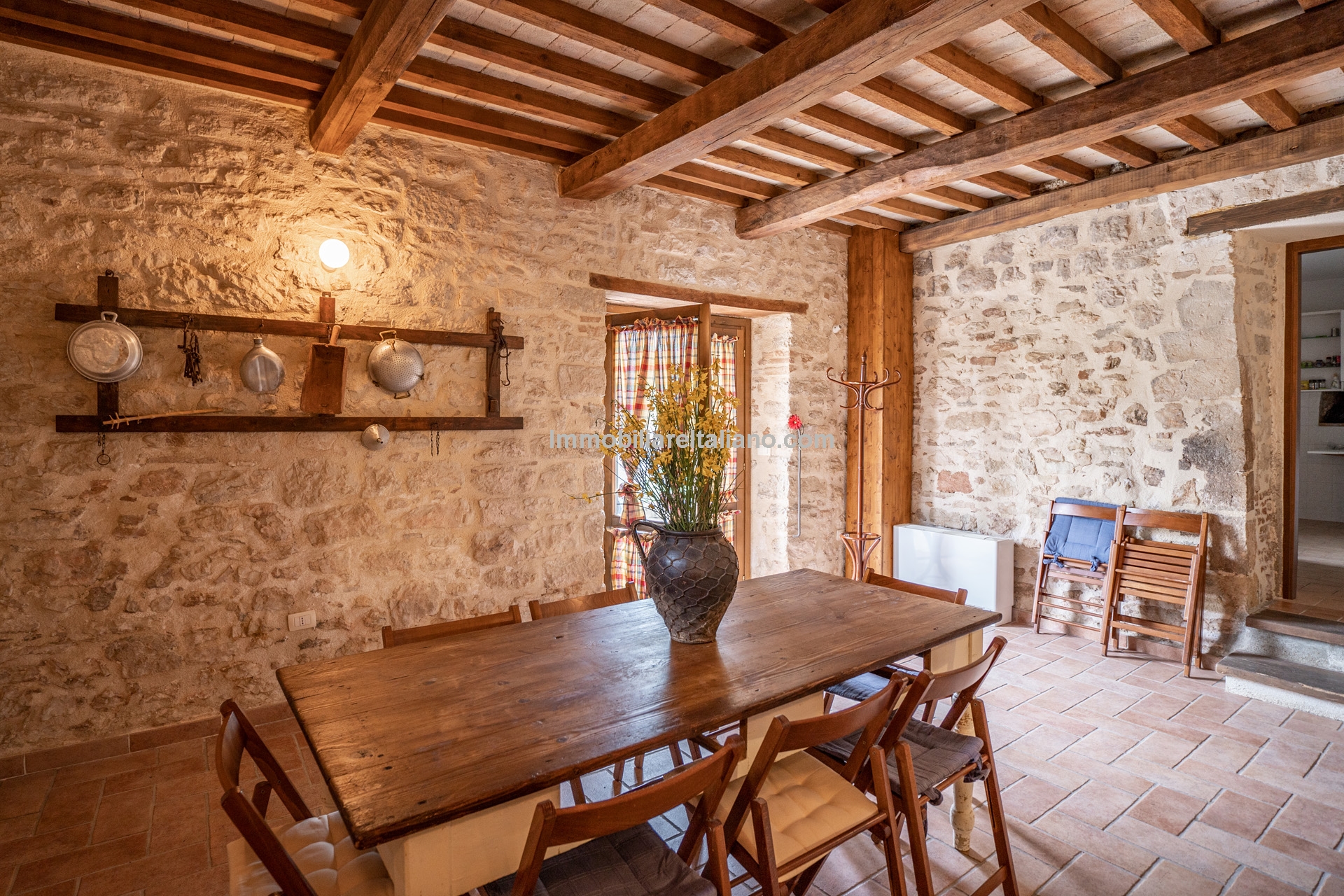 The building has undergone recent renovation and retains its traditional Umbrian character, including terracotta floors, exposed wooden beams, and original wooden elements.