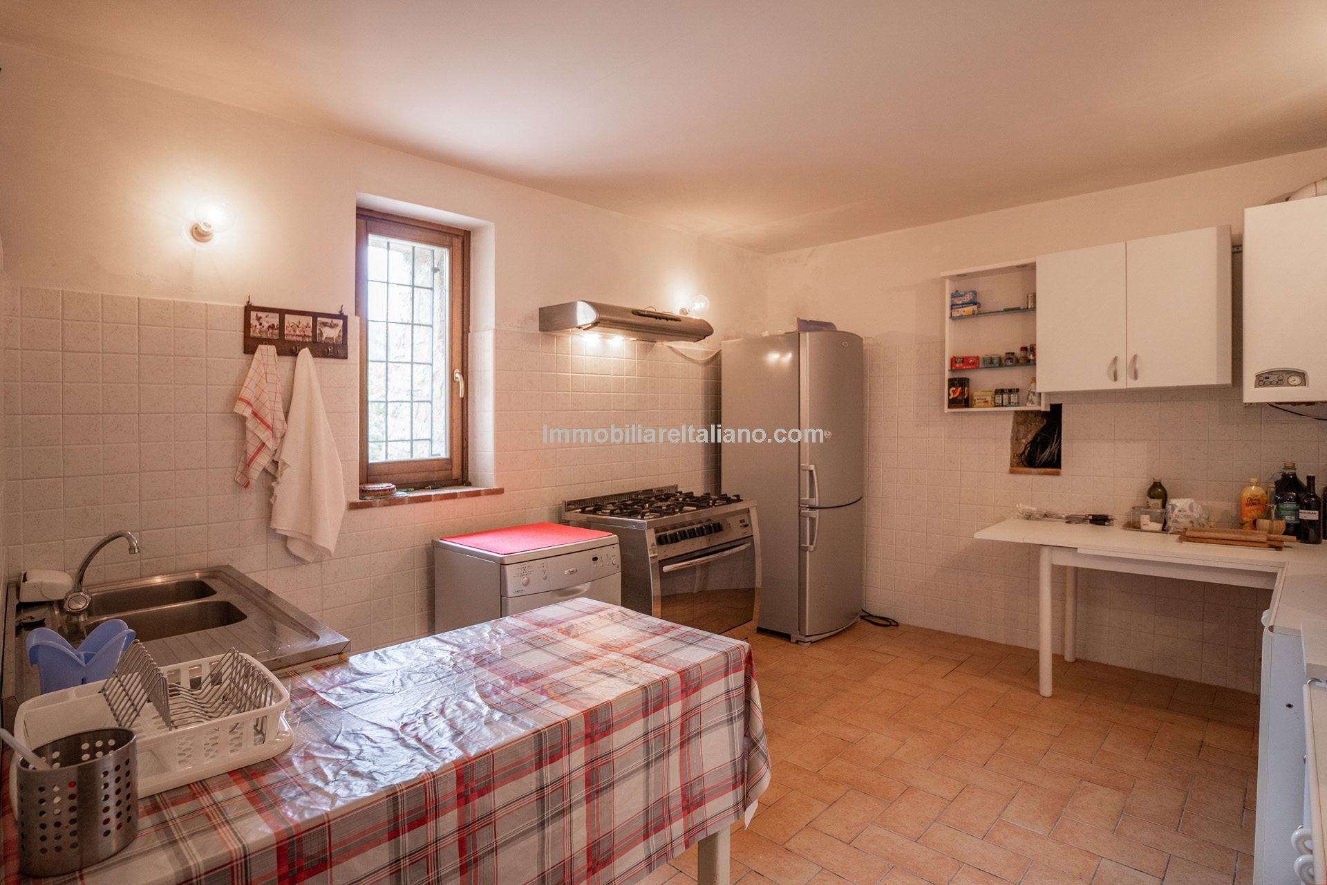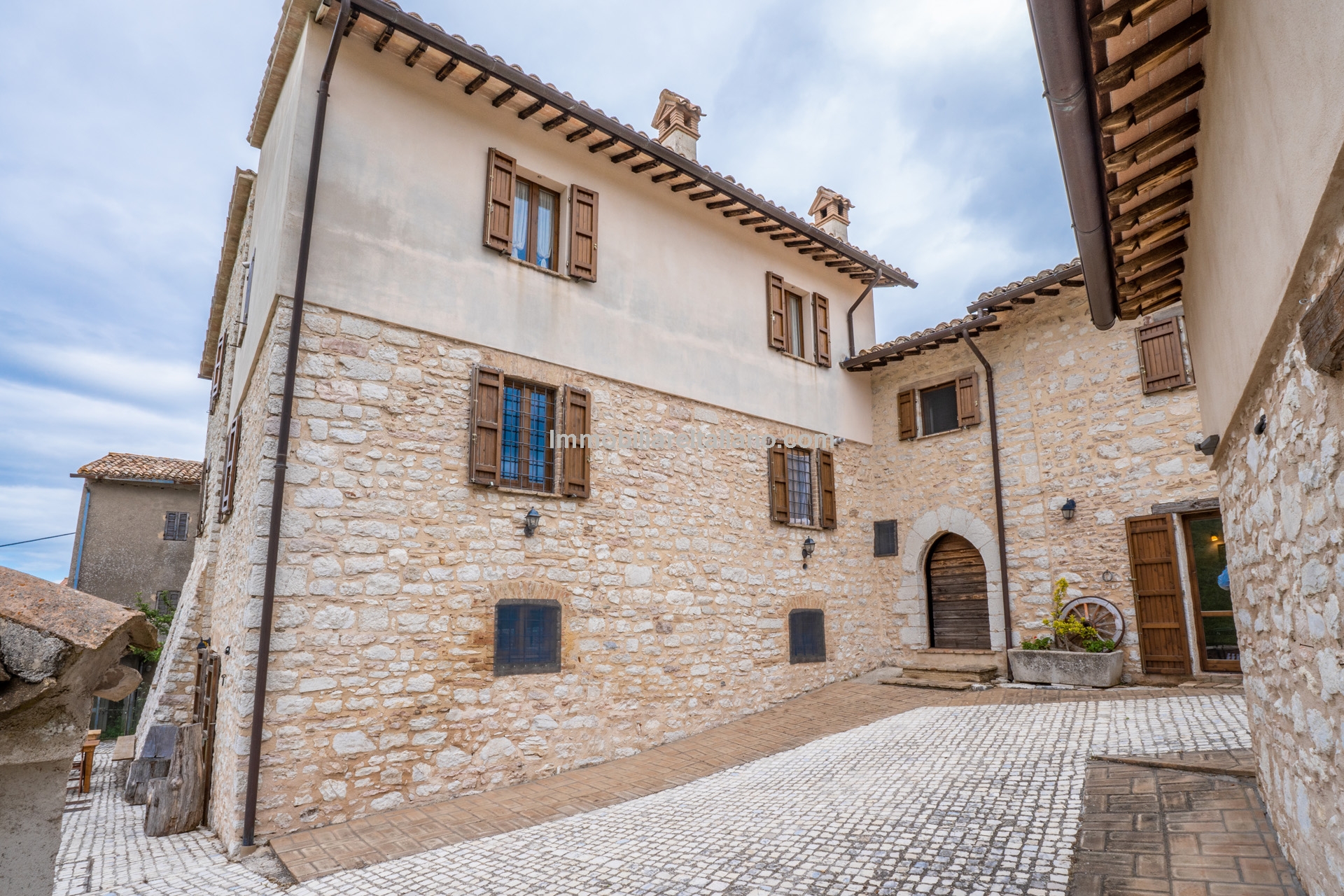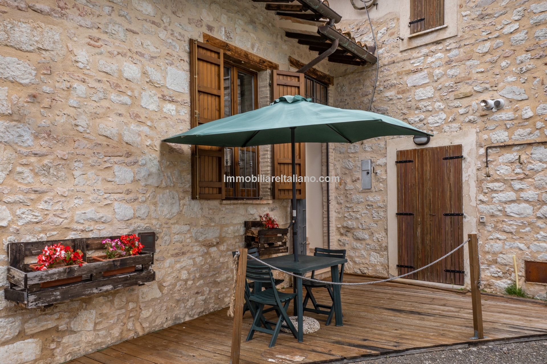 The building has undergone recent renovation and retains its traditional Umbrian character, including terracotta floors, exposed wooden beams, and original wooden elements.