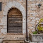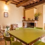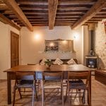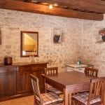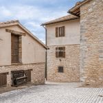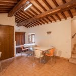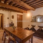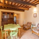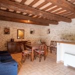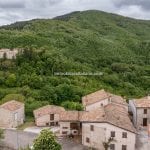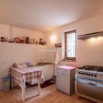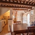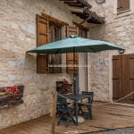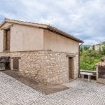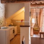 The main house (154 sqm) is arranged over two levels and includes an entrance, a living area with a kitchenette, a large kitchen, two bedrooms and one bathroom. An internal staircase leads to a stone-built room incorporating part of a historic medieval arch, reflecting the village’s original structure. A second unit (61 sqm) provides additional accommodation with a living room and kitchenette, a study, one bedroom, and a bathroom.