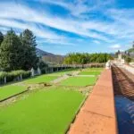 The garden is laid out on two terraces: on the higher one is a simple but well-kept lawn with gravel paths (1,850 sqm) and a characteristic square in Impruneta terracotta (250 sqm) that could serve as an extension for the restaurant in summer or as a location for events. The greenery includes evergreen plants, multicoloured flowers, two large cedars of Lebanon, lime trees, cypresses and evergreen flower beds, interspersed with marble gravel paths and seating for guests.