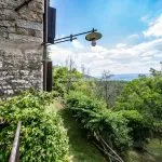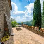 Outside, the Tuscan farmhouse benefits from panoramic terraces with countryside views and a terraced garden of 6,100 m² planted with ornamental shrubs and trees. An olive grove with 140 mature trees produces oil for private use. At the same time, the remaining 7.2 hectares of land consist mainly of woodland with native plants, providing privacy and a traditional Tuscan setting.