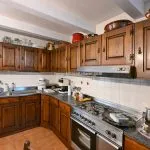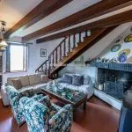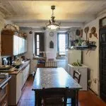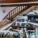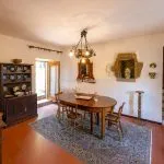 The first apartment includes a large living room, dining room, kitchen, four bedrooms, and two bathrooms. The second apartment offers a dining room with a kitchen, a living room with an original fireplace, four bedrooms, and four bathrooms. This flexible arrangement makes the farmhouse suitable for use as a multi-unit residence, holiday home, or a single large family property.