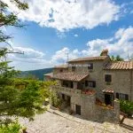 Large Italian countryside home for sale near Sansepolcro, Tuscany. This 17th-century Tuscan farmhouse offers 410 m², two apartments, eight bedrooms, an olive grove, woodland, and panoramic terraces.