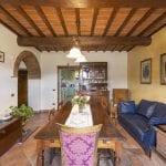 This Italian farmhouse for sale is located just 9 km (15 minutes) from Arezzo, in the Tuscan countryside near the Casentino Valley. The property includes a fully renovated rural estate with several buildings totalling 681 m² and five bedrooms. The farmhouse is easily accessible via a paved road, with a nearby village less than 1 km away providing essential services.