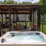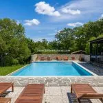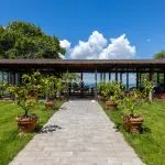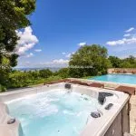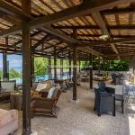 To the rear of the house is a 12 × 6 m infinity edge swimming pool with stone-paved sun deck and a 140 sqm (1,506 sqft) pergola equipped with a barbecue area. Beneath the pergola is a large underground space of 188 sqm (2,023 sqft), currently housing the pool’s technical systems and a cellar, which could be adapted into a fitness or wellness area.
