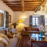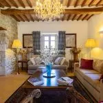 Restored Italian farmhouse property for sale near Castiglione d’Orcia in Tuscany in a quiet private countryside position presently used as a small B&B. 5 bedrooms, land and gardens, pool, olive grove.