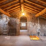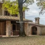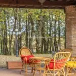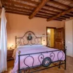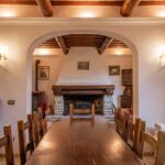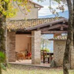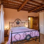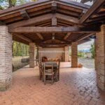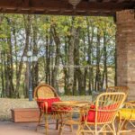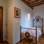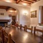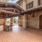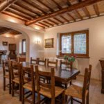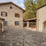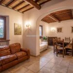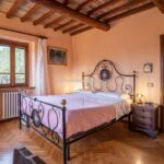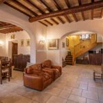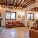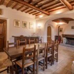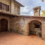 Traditional Tuscan architectural elements are retained throughout, including stone and brick walls, exposed wooden beams, ceramic and parquet flooring, iron window grates, and an original wood-fired oven. A paved porch connects the farmhouse to the barn and opens onto a spacious courtyard for outdoor dining and social gatherings.
