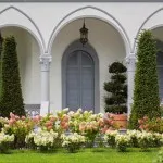 The 6000 square metre garden has been maintained in its original design, retaining the centuries-old trees.