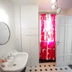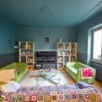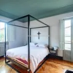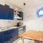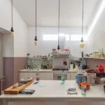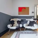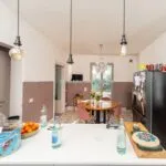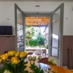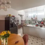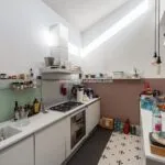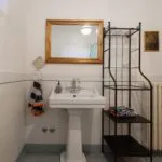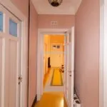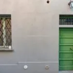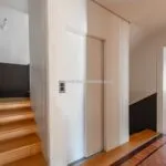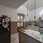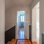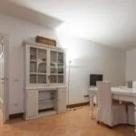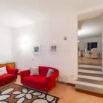 In the opposite direction, the corridor opens to an apartment with its own entrance from the adjacent alley, designed to host guests with their privacy intact. This apartment spans two levels, with a living room on the street level and, a few steps up, a dining room, kitchen, bathroom, and double bedroom.