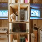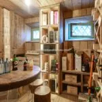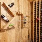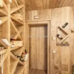 A staircase from the ground floor descends to a corridor, cleverly designed as a cloakroom, leading to a wine cellar. This inviting space, crafted from large wooden planks and featuring modular wine racks, creates a perfect atmosphere for wine tasting, centred around a circular table with solid wood stools.