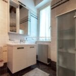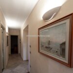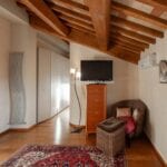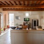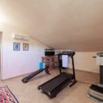 The villa, with a generous floor space of 560 sqm, spans three levels and is segregated into two apartments. The larger apartment, occupying 430 sqm, extends over the villa’s three floors, accessible by an external staircase, leading into a spacious living room. This area opens up to a sleek, modern kitchen and laundry room, both of which lead out to a 60 sqm porch set up as a summer lounge complete with a dining table, barbecue, and chaise longues. The first floor also houses a private office and a guest washroom. A corridor ushers one into the sleeping quarters, featuring a master bedroom with an en-suite and walk-in wardrobe, two double bedrooms, and a communal bathroom. The attic is cleverly divided into a large gym and an additional bedroom with a private bathroom and a small walk-in wardrobe.