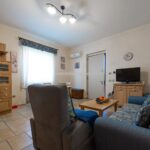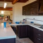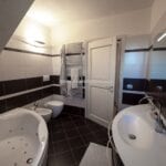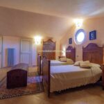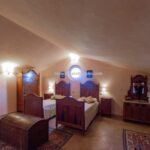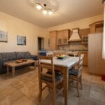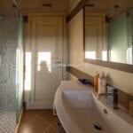 The guest apartment, covering 130 sqm on the ground floor, includes a living area with a charming kitchenette, three bedrooms, and two bathrooms equipped with whirlpool baths and showers.