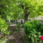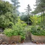 A staircase leads up to a higher level of the garden where there is a modern 12 × 6 m swimming pool with a small building, with a changing room, bathroom, storage room and large wood-burning oven.