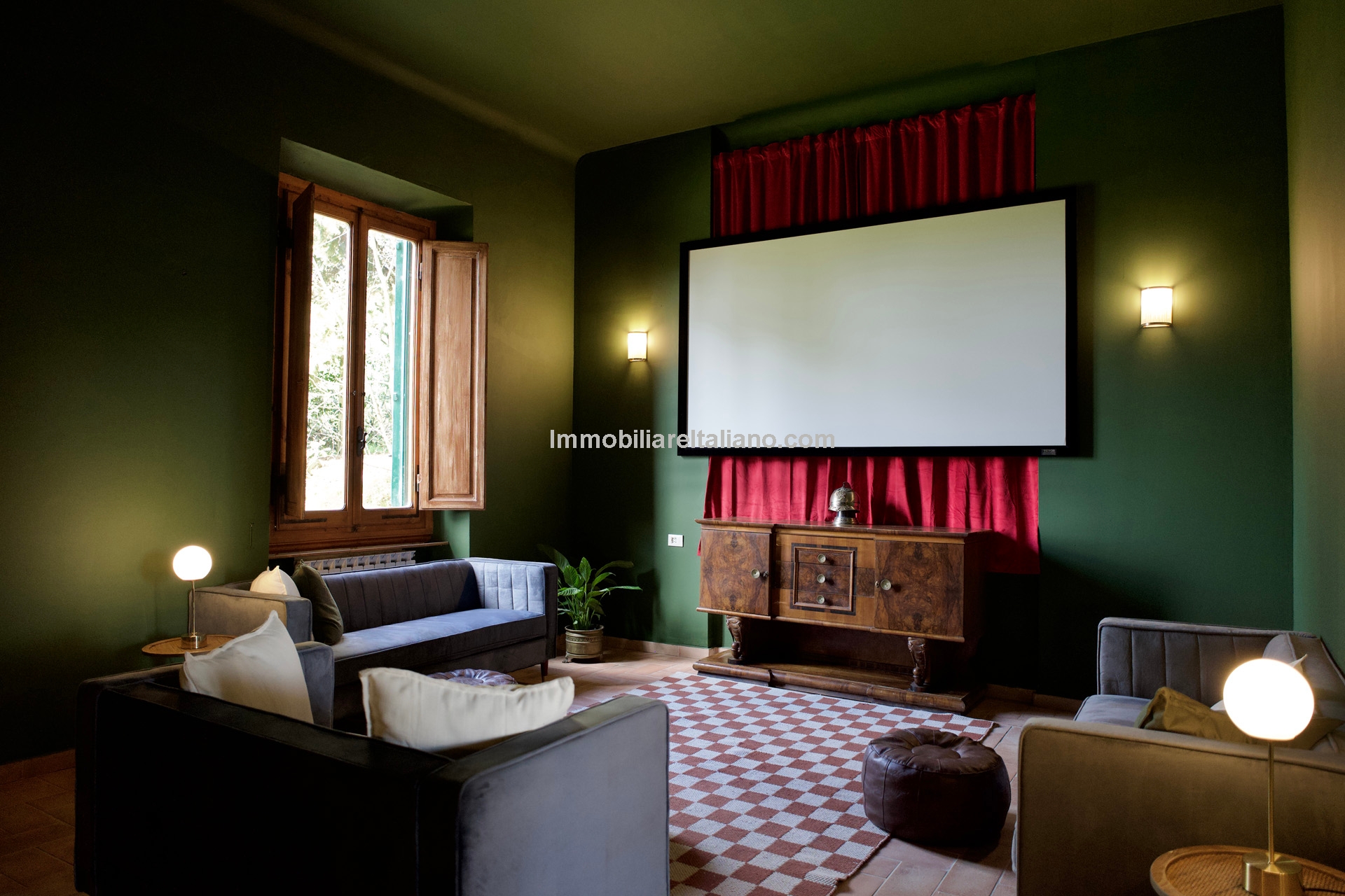 Liberty style villa for sale on the hills of the Valdarno, Tuscany. Over 900 sqm of living space, 5/6 bedrooms, panoramic views, olive grove, spa, and cinema. For sale furnished. Close to Florence and Arezzo. Liberty style is the Italian version of Art Nouveau.