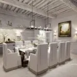 The property’s fine finishes (such as masonry vaults and terracotta floors) have been preserved wherever possible, while where replacement work was necessary, fine materials such as oak beams and marble were used, as well as Ariostea porcelain stoneware for the service rooms.