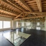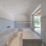 For those seeking relaxation and rejuvenation, the wellness centre F awaits with its 235 square meters of space, featuring three interconnected sections. The central lounge offers guests a tranquil space to wait and unwind. To the right lies the fitness area, complete with a yoga room, gym, sauna, and changing room equipped with a bathroom. On the left side, visitors can indulge in the massage area, also accompanied by a changing room and bathroom. Ascending an external staircase leads to a charming terrace, providing access to an independent apartment featuring a living area with a cooking corner and a bedroom with a bathroom.