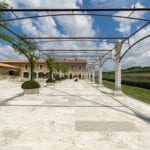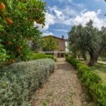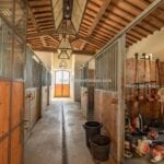 A tree-lined avenue adorned with vineyards and olive groves leads to the second section of the property, where agricultural buildings, staff accommodations, and horse stables are located.
