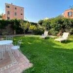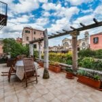 On the rear, the house features a 216-sqm garden, enclosed by a brick wall covered in creepers that make it very private and keep it away from prying eyes. From the first floor, one can exit onto a spacious terrace with columns (32 sqm) and from here a staircase descends down into the garden. It is believed that this was once the main entrance of the palazzo.