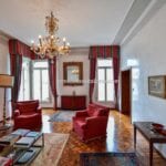 The main door of the palazzo, located along the main façade overlooking the sea, leads into the noble apartment (264 sqm – 2,840 sqft, 4 bedrooms and 3 bathrooms) on the first floor (piano nobile). Interesting detail, the reception hall at the centre of the floor features huge windows at both ends: towards Southwest, the hall overlooks the sea and the isle of Giudecca, while towards Northeast it overlooks the garden and opens up onto a spacious terrace. From here, a staircase leads down to the garden.