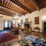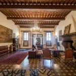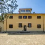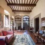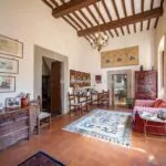 Located near to Arezzo on the banks of the river Arno the villa has been finely restored and features 7 bedrooms and 8 bathrooms with beautiful reception rooms with very classic and elegant finishes. The guest annex features 3 bedrooms and 3 bathrooms. There is also a a private chapel and a 10,000-sqm park garden which softly descends towards the river and houses a 12 × 6 m swimming pool. In total, the estate covers 6.7 ha of land.