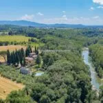 The estate, covering altogether roughly 6.7 hectares (16.5 acres), is set along the banks of the Arno river. On the western side, the villa is surrounded by trees, which ensures great privacy, while on the opposite side are the meadows and the olive grove (over 8,500 sqm) that can produce sufficient extra-virgin olive oil for personal use.