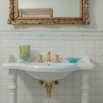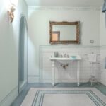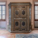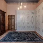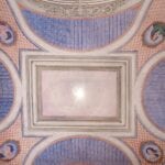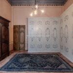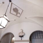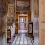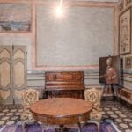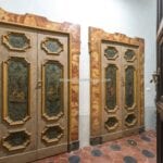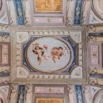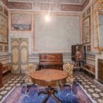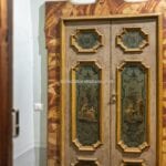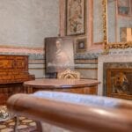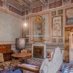 Each door is embellished with marbled wooden lacquering, a popular 18th-century technique inspired by neoclassicism, which also introduced trompe-l’œil architectural elements seen in the painted columns adorning the walls and ceilings of the reception room. The master bedroom features illusionary architecture with Caryatids, and the period is further represented by eight black-and-white perspective views framed in gold, showcasing significant Italian cities’ art buildings, complemented by festoons, floral motifs, and satyrs. An elegant tapestry decorated with rosettes and stencils, perfectly preserved to this day, adorns the ceiling of the room currently used as a dressing room.