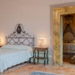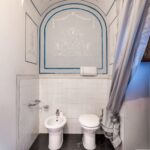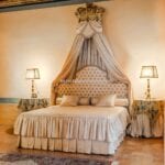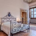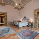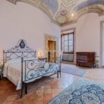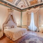 Some ceilings boast coffered designs with grand marble columns, others depict pastoral or festive scenes, while those in the bedrooms symbolise love, portrayed through Cupid in various states. The bedrooms, retaining their historical charm, are closely situated to the three bathrooms, benefitting from ample natural light and picturesque views of both the main avenue and the charming Sant’Andrea street adjacent.