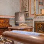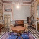 Each room retains its original name, inspired by the main theme of its ceiling frescoes. The Sant’Andrea hall is named after four lions depicting the martyrdom of the apostle, after whom the street below is named. Cupid’s room features the Greek god, depicted blindfolded and as a harbinger of passionate love on the ceiling, symbolising a matrimonial blessing. The Hall of Mirrors is distinguished by its painted mirrors in oval shapes with gold frames, reflecting the visages of young women, embodying neoclassical elegance and feminine beauty and grace.