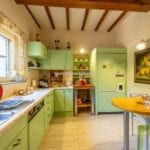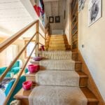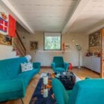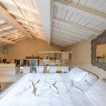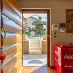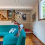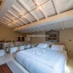 The guesthouse (115 sqm / 1,237 sqft) is a charming two-story building. The ground floor has a living area with a kitchen, while the first floor, accessible via an external entrance, houses a bedroom, bathroom, and walk-in closet.