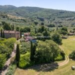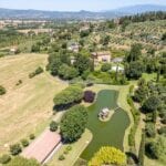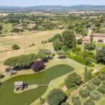 For sale near Arezzo, this hillside property offers a luxurious villa, multiple buildings, farmland, lake and an olive grove. The estate spans 12.9 hectares (31.9 acres) and includes approximately 7,350 sqm of landscaped garden with a swimming pool and 12.2 hectares of agricultural land featuring an olive grove and arable fields. It is well-suited as a private luxury residence or could be used as a prestige vacation rental property.