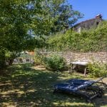 The castle is surrounded by about 2,600 m² of paved courtyards, gardens, and terraces, including a secluded 8 × 4-metre swimming pool bordered by stone walls and hedges. The property also includes approximately 6,300 m² of surrounding land and fields.