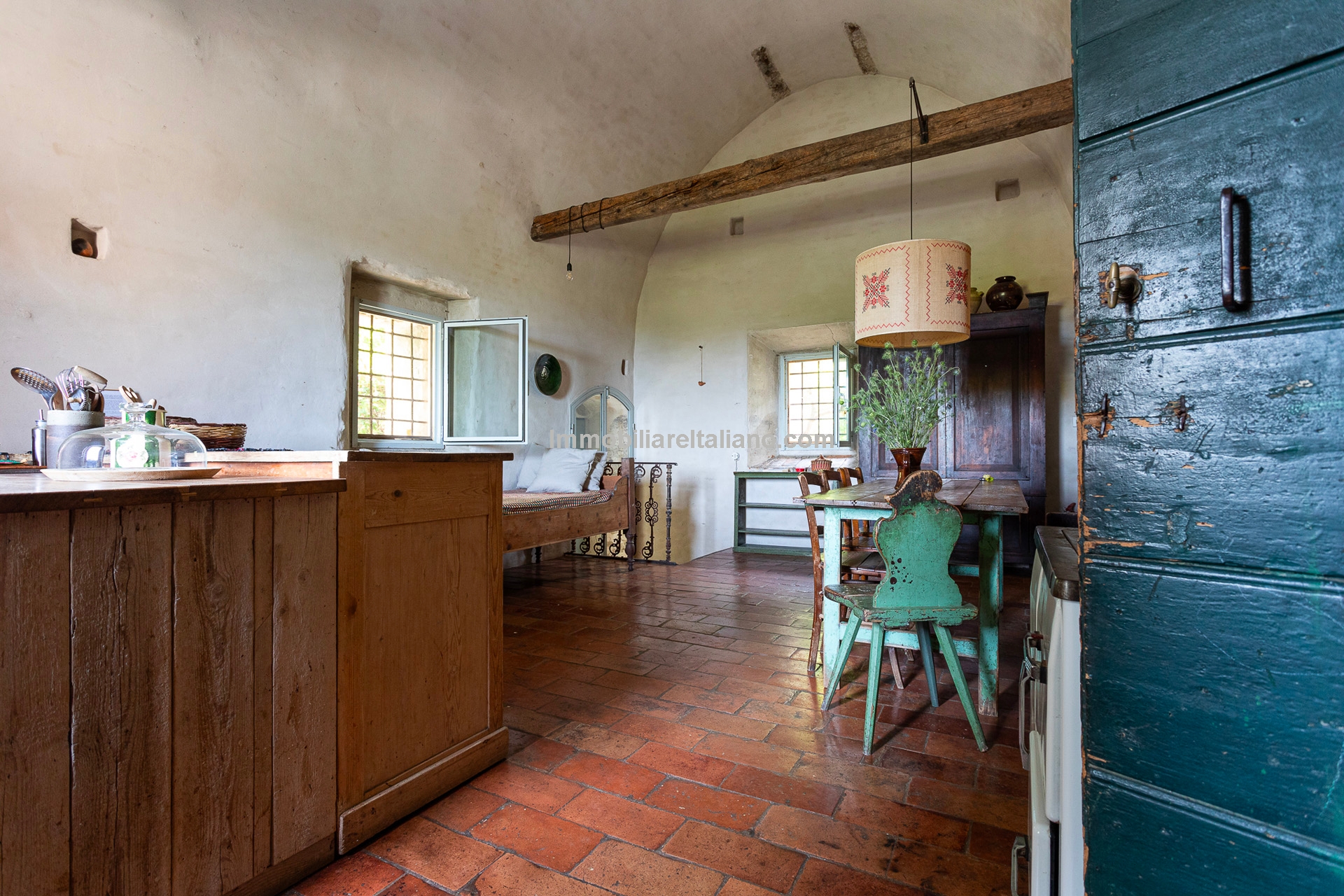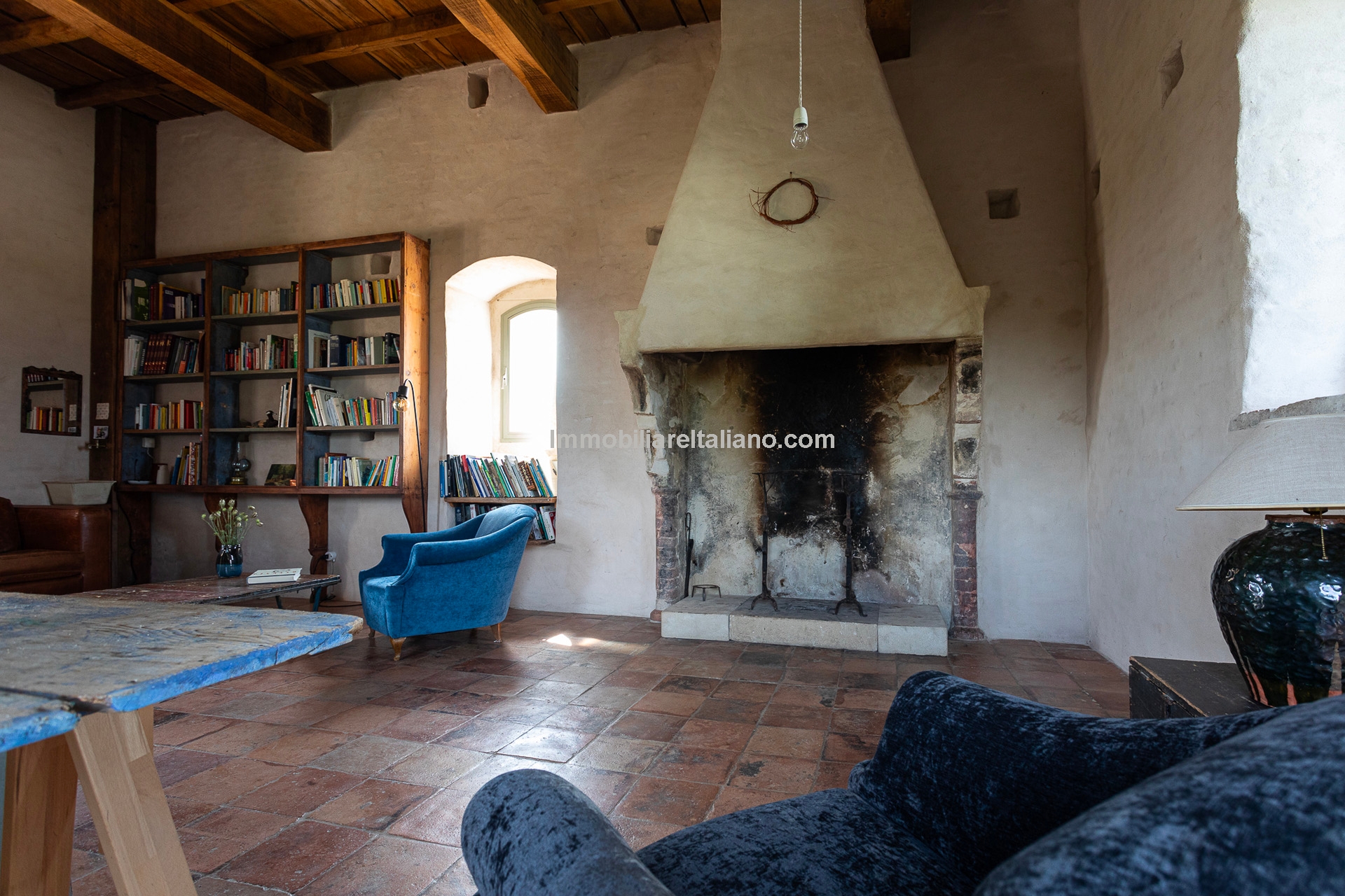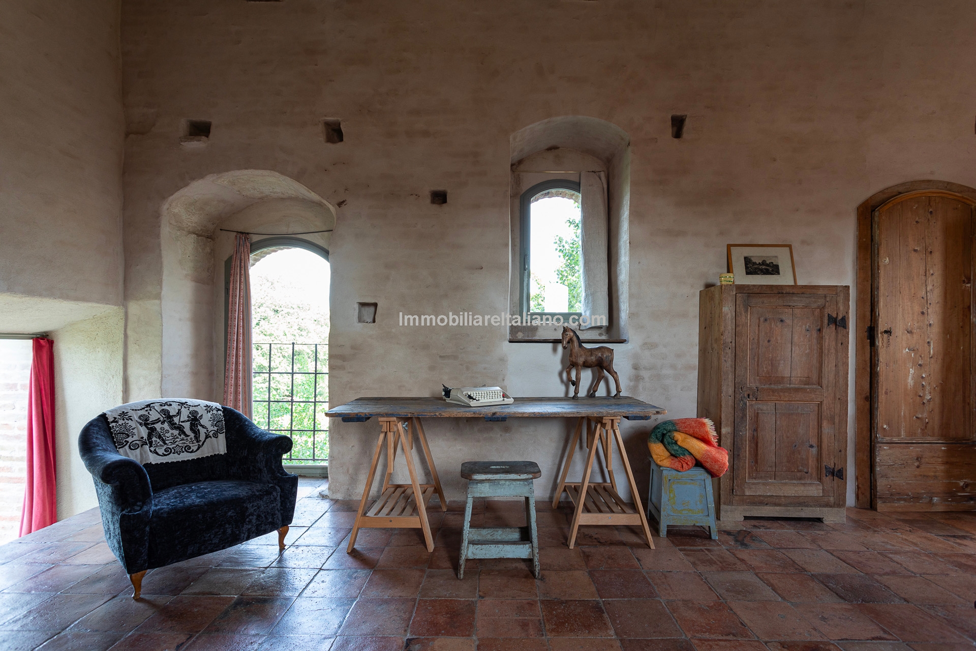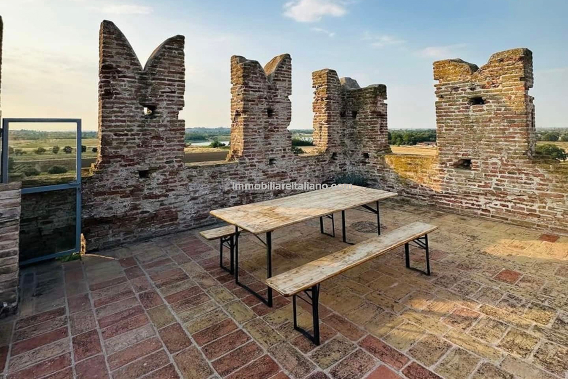 - MAIN FEATURES: Stone and brick walls, 17th-century original terracotta floor, vaulted ceilings, exposed wooden beams, original fireplace, panoramic terrace, Ghibelline crenellations, fenced garden