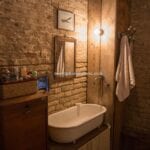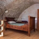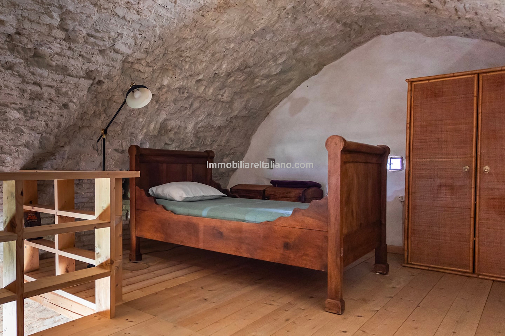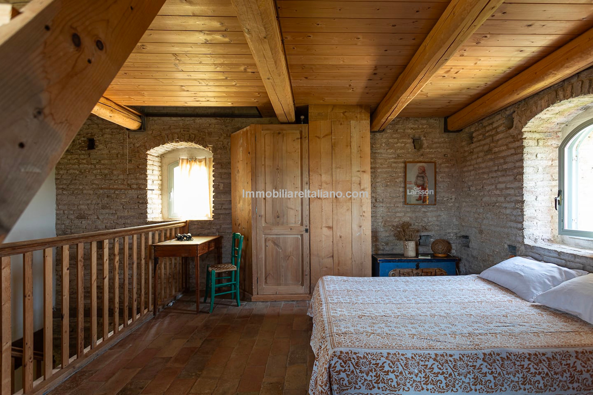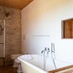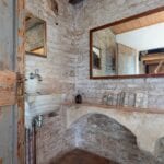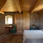 The upper floors include two bedrooms with en-suite bathrooms, plus an additional sleeping area in a wooden loft. In total, the property offers three bedrooms and three bathrooms, making it suitable as a character home in Italy or a second residence.