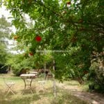 Externally, the property includes a well-maintained private garden of approximately 732 square metres, fully fenced and planted with mature trees, including pomegranate. The outdoor area supports typical Mediterranean living, with space for outdoor dining and leisure. The property is accessed via a short private road and benefits from an open, sunny position.