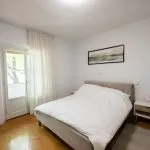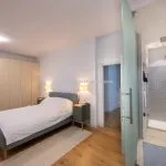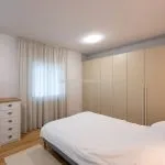 The upper floor, accessible from a porch facing the parking lot, opens with an entrance hall that leads to the large glazed living room with balcony, a dining room and a service bathroom in the corridor. Continuing down the hallway leads to the second bedroom, and further beyond to a passageway connecting three other bedrooms (one of which has its own private bathroom) and a shared bathroom.