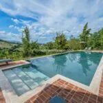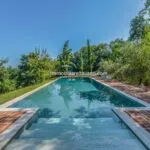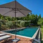 The villa has a very nice 11,300 sqm garden which is landscaped along the soft slope of the hill which ends with a pool area. The 14 × 7 m pool is surrounded by a terracotta-paved solarium overlooking the valley.