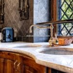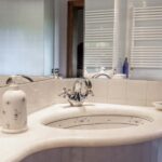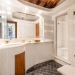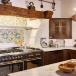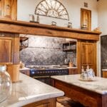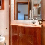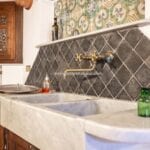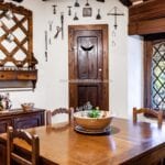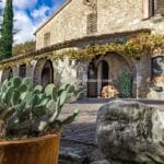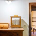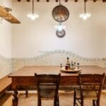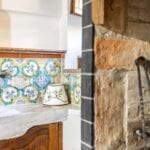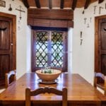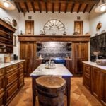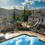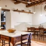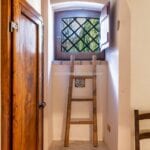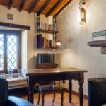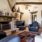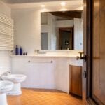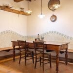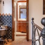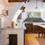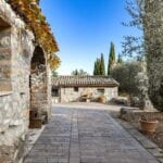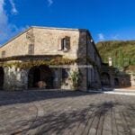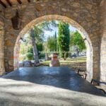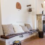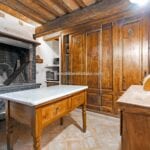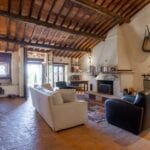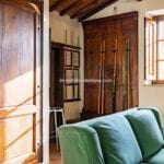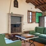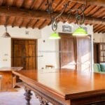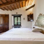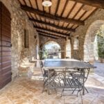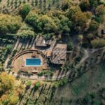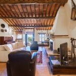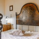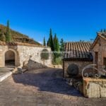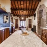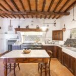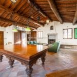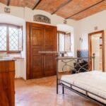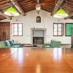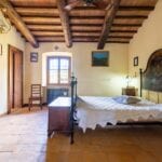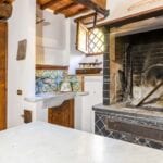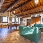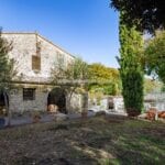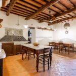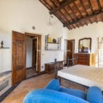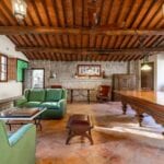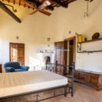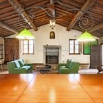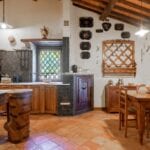 The centrepiece of this estate is the main farmhouse, a rustic, two-story building spanning 524 square metres, complete with 7 bedrooms and 9 bathrooms. It’s divided into two independent apartments, each with a unique layout and features, including a living room, dining area, kitchen, and en-suite bathrooms. The farmhouse’s authentic charm is preserved through original terracotta floors, natural wooden beams, and functional engraved stone fireplaces, complemented by dark parquet flooring in areas where original flooring was absent.