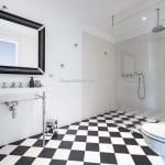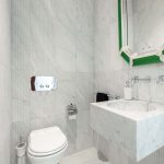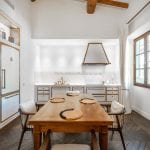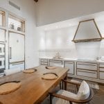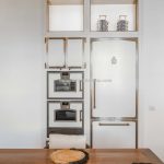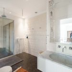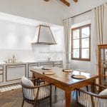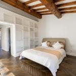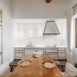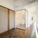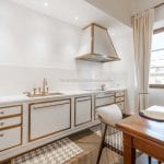 Inside, the apartment has been carefully designed to maximise light and space. The main living area includes an open-plan lounge, dining area and a custom Gullo kitchen equipped with Gaggenau appliances. A hallway leads to a guest bathroom with a laundry area, and then to the sleeping area with a master bedroom with an en-suite bathroom and two further bedrooms sharing a second bathroom. One bedroom opens onto a private terrace overlooking the courtyard, and the hallway gives access to a small balcony with similar views.