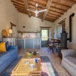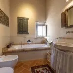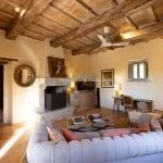 The luxury farmhouse measures about 300 m² (3,228 ft²) and includes three bedrooms and four bathrooms. Renovation works have preserved classic Umbrian architecture such as stone walls, terracotta floors, and exposed wooden beams, while adding modern systems including solar panels for underfloor heating and an air-conditioning heat pump. The house is also certified by a Feng Shui master.