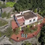 Access to the villa is both via a staircase descending along the cliff and via a short inclined elevator track starting from the road above.