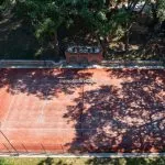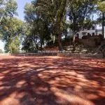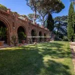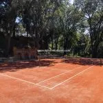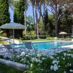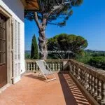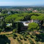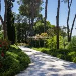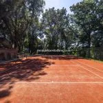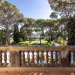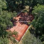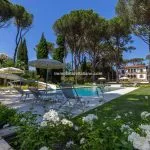 The property sits within a landscaped 21,000 m² (5.2 acres) park garden, planted with mature trees and century-old pines. The gardens are arranged over several terraced levels connected by terracotta steps, with a gravel driveway leading up from the electric entrance gate. In front of the villa lies a 15 × 7 m swimming pool surrounded by a stone-paved solarium. Nearby, shaded by trees and fitted with night lighting, is a synthetic tennis court, ideal for private leisure or guest use.