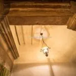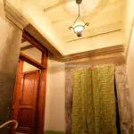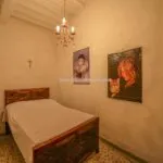 The apartment is in good condition but would benefit from cosmetic updating and features typical features of historic buildings, including wooden beams supporting the roofs and stone decorations around the doors.