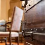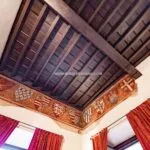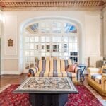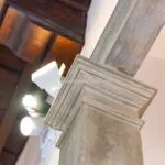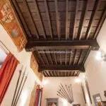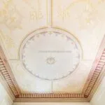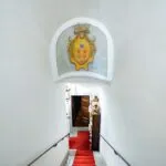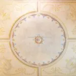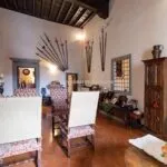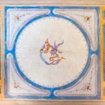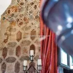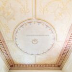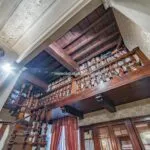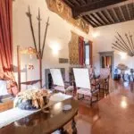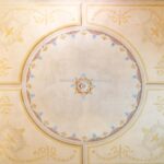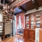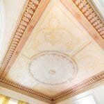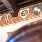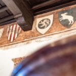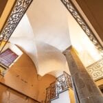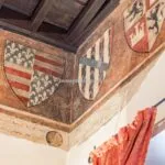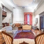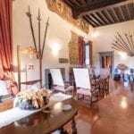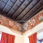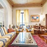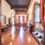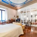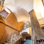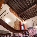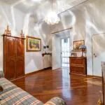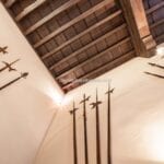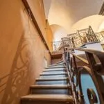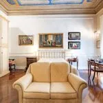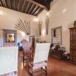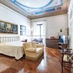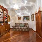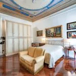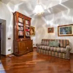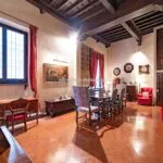 From the exclusive street-level entrance, a private staircase reaches the main apartment (312 sqm – 3,357 sqft). Halfway up the stairs, on the left, a door leads to a small living room (potentially a small guest room) with an exit to the private courtyard (8 sqm – 86 sqft). Arriving on the second floor, the staircase ends in a hallway with an elevator. From here one passes into two large reception rooms: the first one, on the left, is a large hall with high frescoed ceilings and damask wallpaper; in the corner, a large wood-panelled mezzanine niche houses the apartment’s library. On the opposite side of the hallway, the second living room is more austere but no less elegant, with a high wood-beamed ceiling and remnants of finely restored and recovered frescoes. From the living room, one then proceeds to the dining room and kitchen with pantry. Beyond the dining room, a corridor overlooking the inner courtyard leads to the bedroom, living room and two bathrooms. The bedroom and living room are separated by a large window that can be opened to directly connect the two rooms. The large windows in the lounges ensure great brightness in the rooms and allow one to admire the frescoes on the ceilings and walls, while the high ceilings (exceeding 4 m in the lounges) give an imposing, almost palatial appearance to the apartment, further enriched by the frescoes in typical medieval taste that still decorate some portions of the wall and the fascia under the wooden beams.