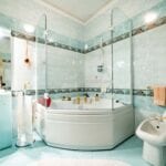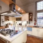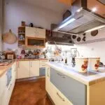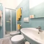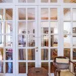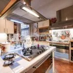 On the first floor, the same level as the mid-stair sitting room of the main apartment is a cosy guest apartment (65 sqm – 699 sqft): from the condominium staircase, the door opens into a long corridor with an exit onto the inner courtyard (shared with the main apartment) and bathroom. Going further in, the corridor ends in a spacious living area, connected in turn to the kitchen and the bedroom.