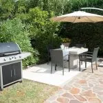 The dependance has kept the original rustic look with the dark wood roof, original doors and windows.