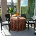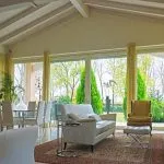 The living room has direct access to a covered porch with view on the garden, ideal for outdoor dining.