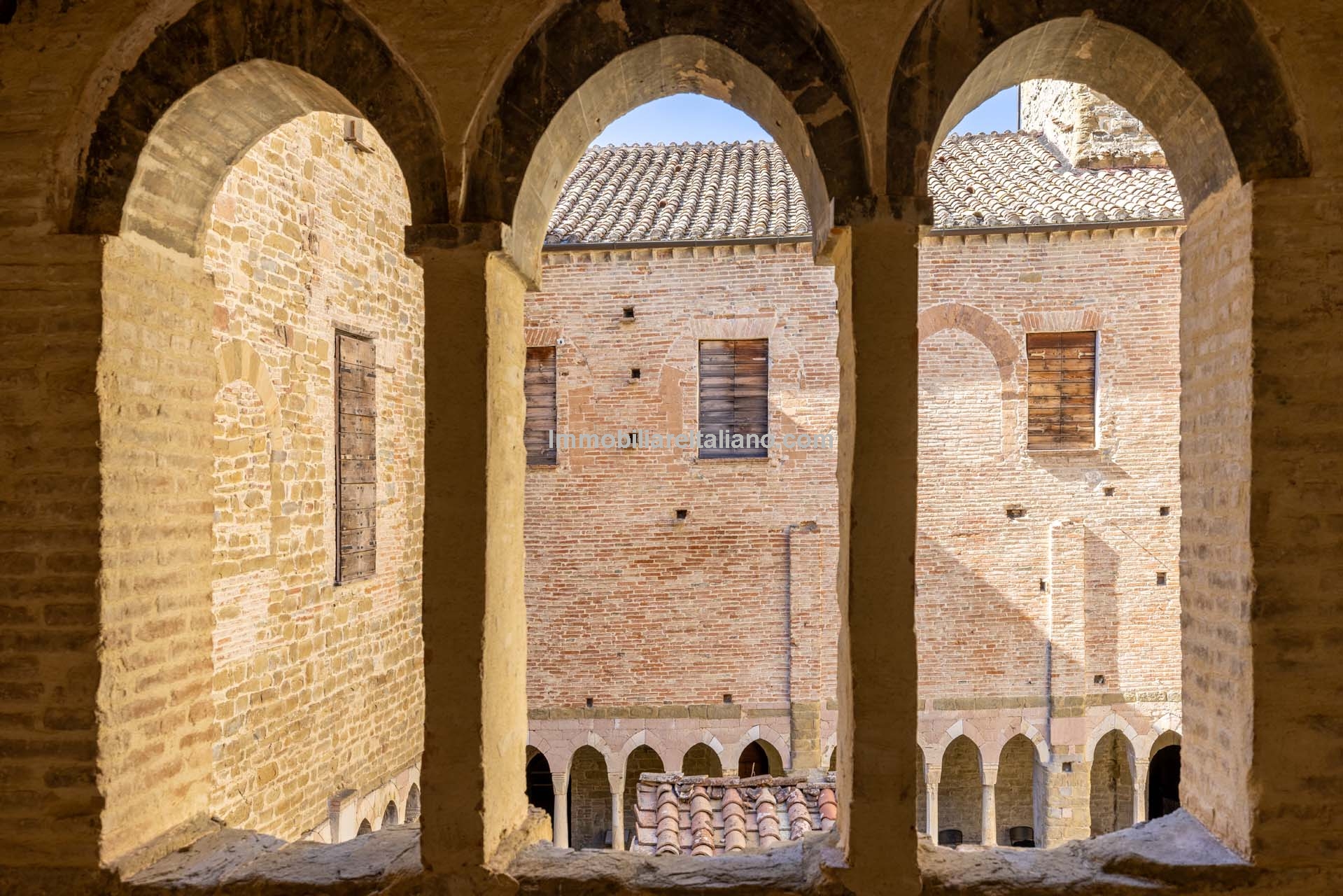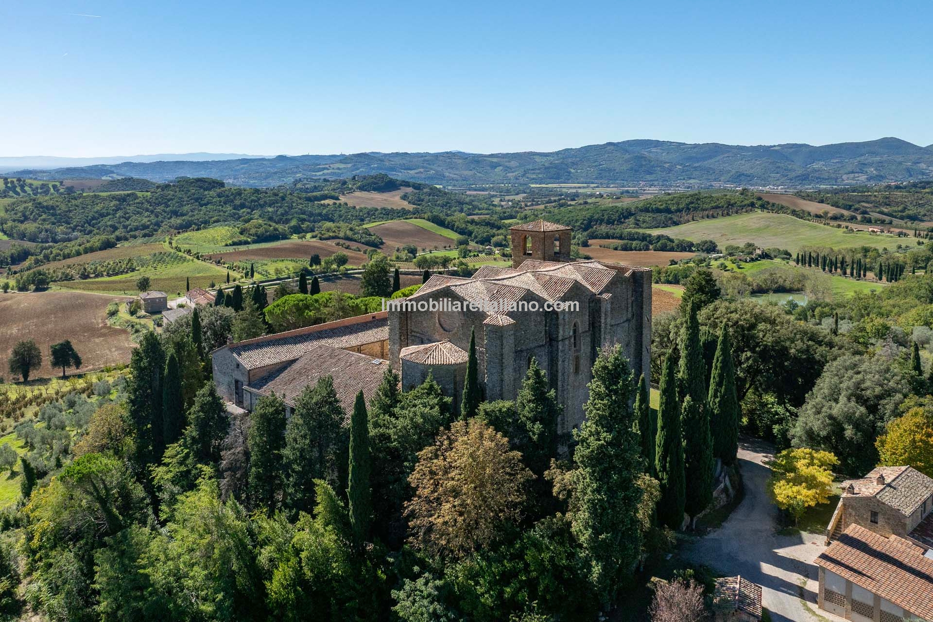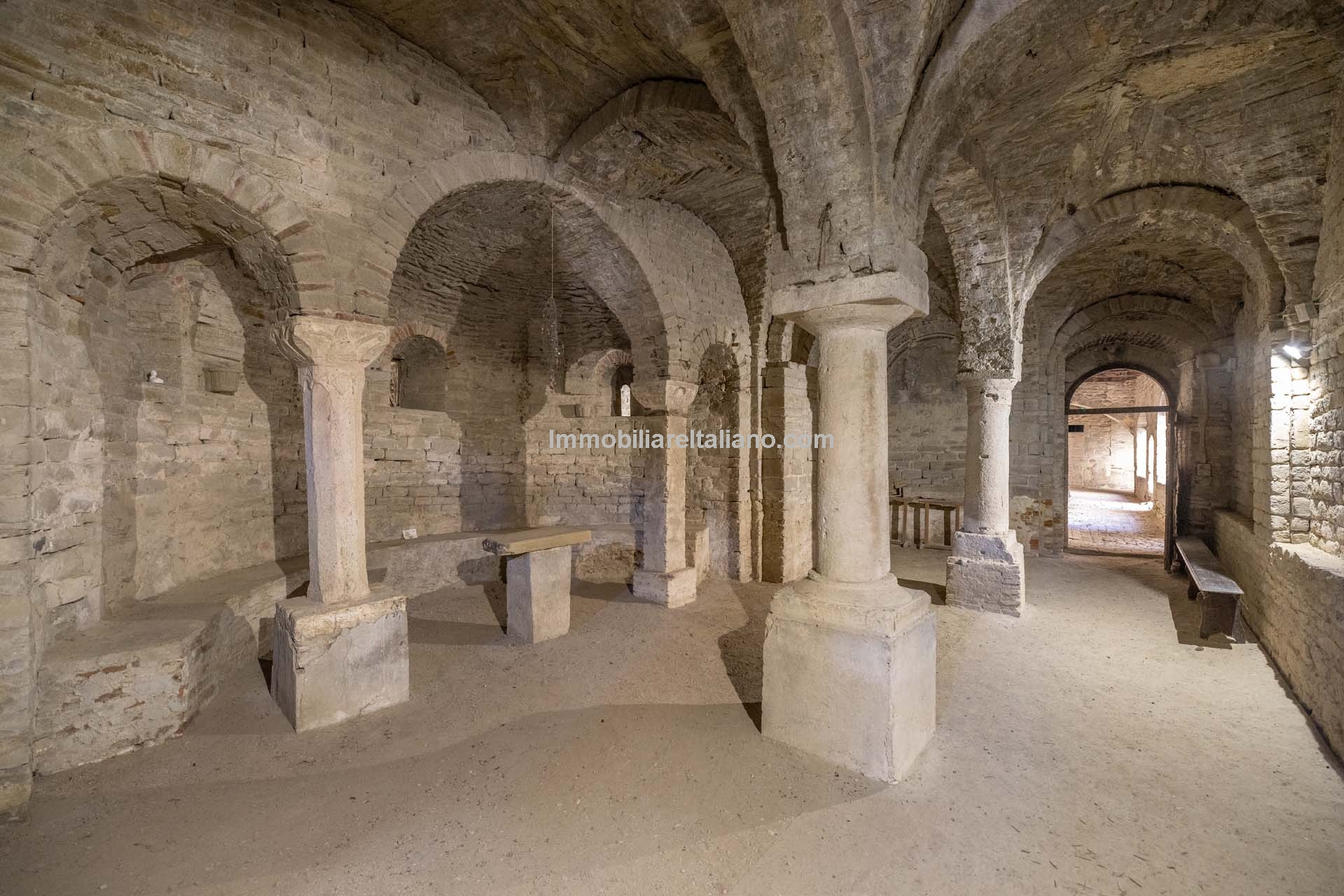 - MAIN FEATURES: Medieval abbey, stone and brick walls, wooden beams, coffered ceilings, cloister, 13th-century church, vaulted ceilings, crypt, original frescoes, terracotta floors, original fireplaces, country houses to be restored, ruins, vineyards, olive grove