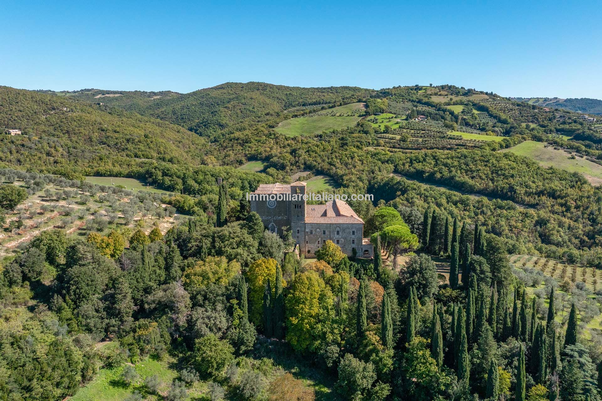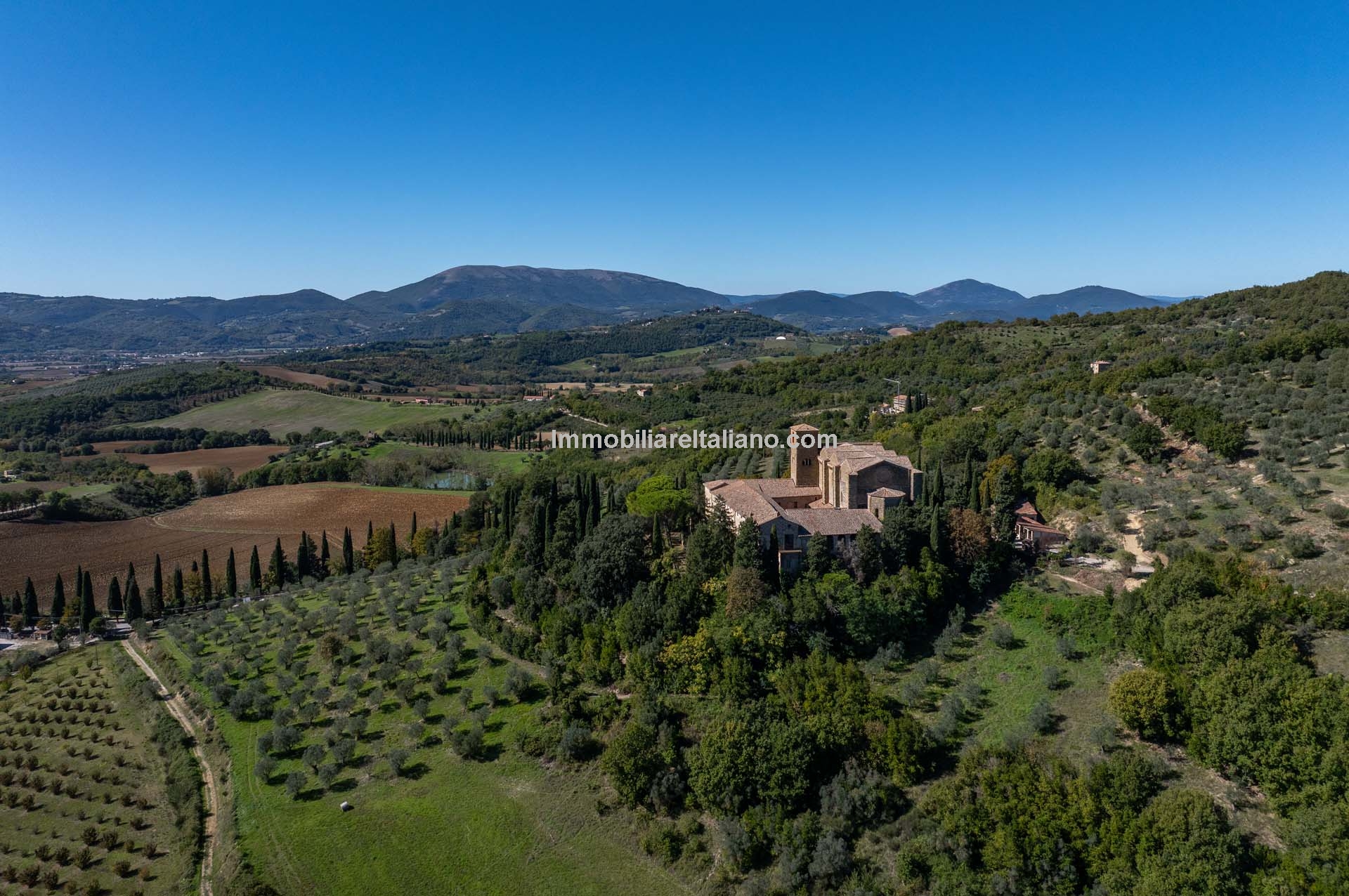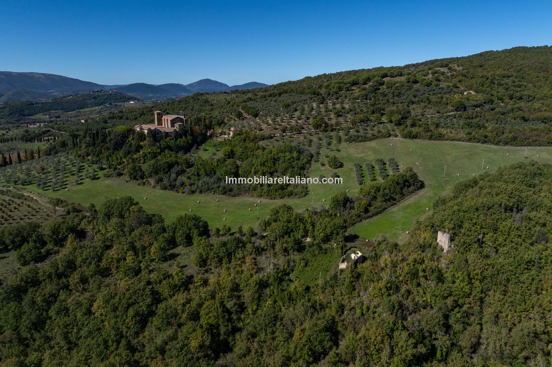 Large estate for sale in Umbria with medieval abbey, buildings, land, vineyards and olive groves. Significant development potential near Perugia.