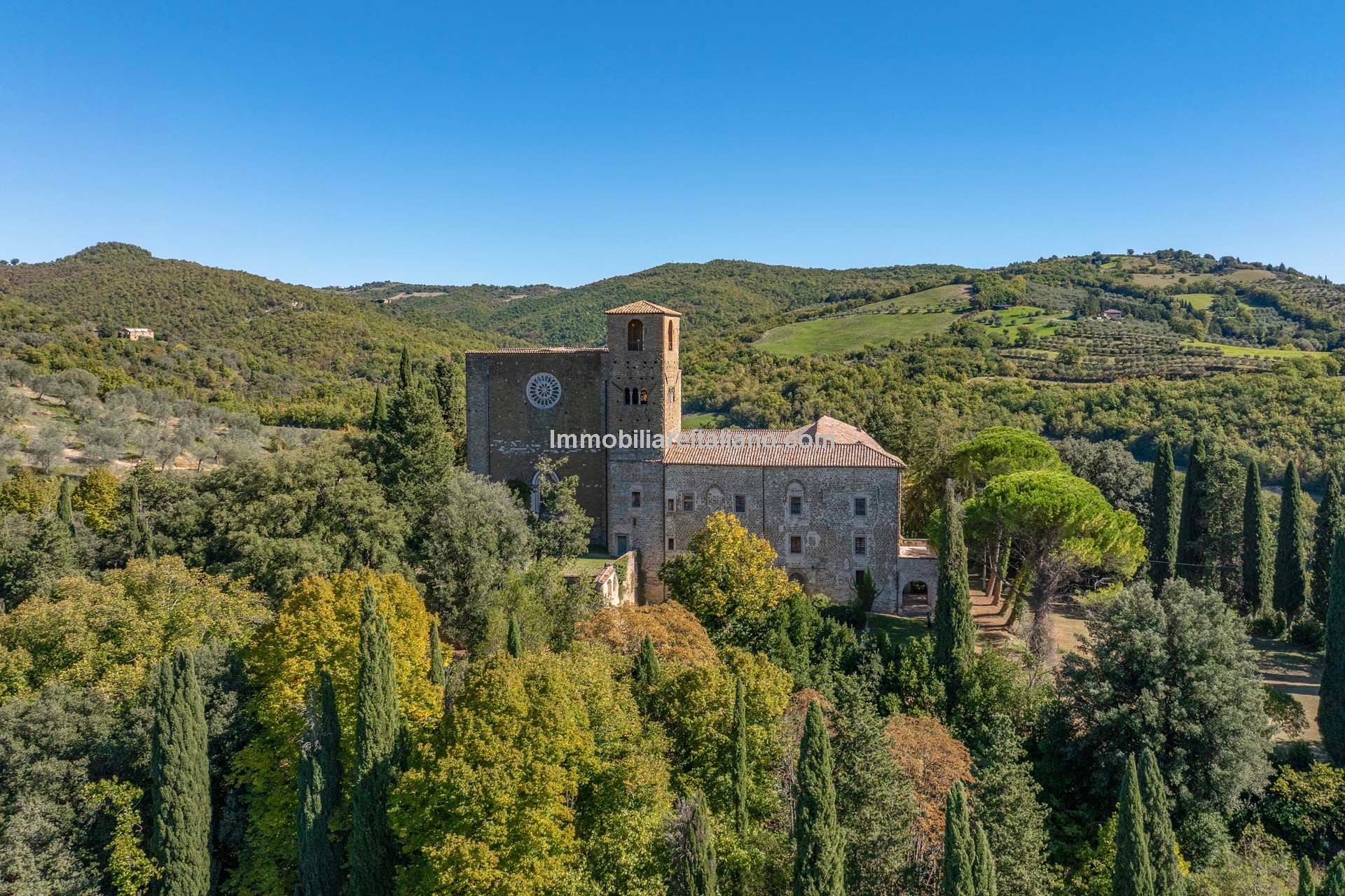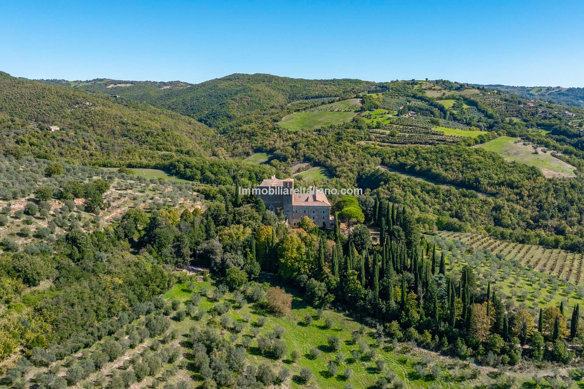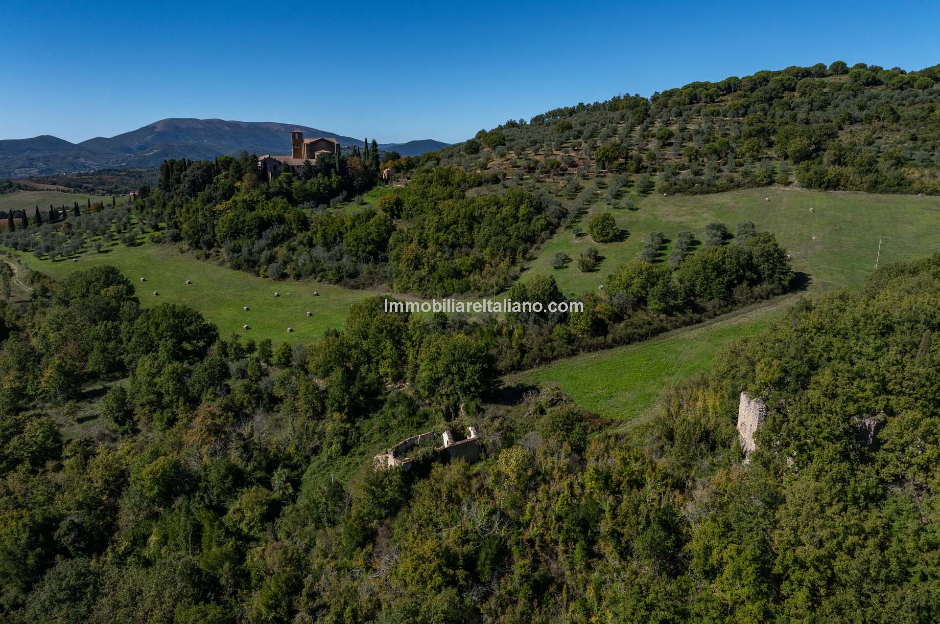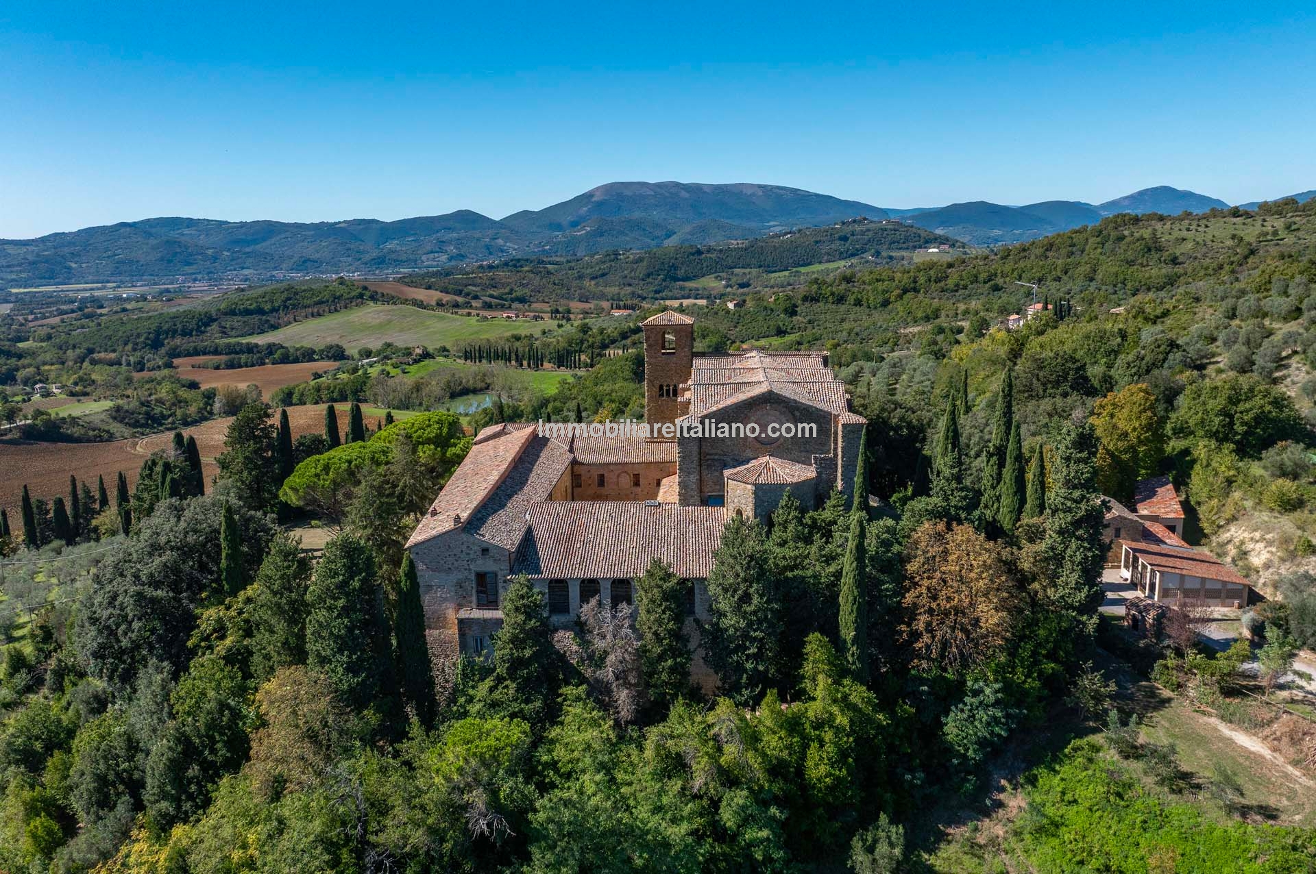 Large estate for sale in Umbria with medieval abbey, buildings, land, vineyards and olive groves. Significant development potential near Perugia.